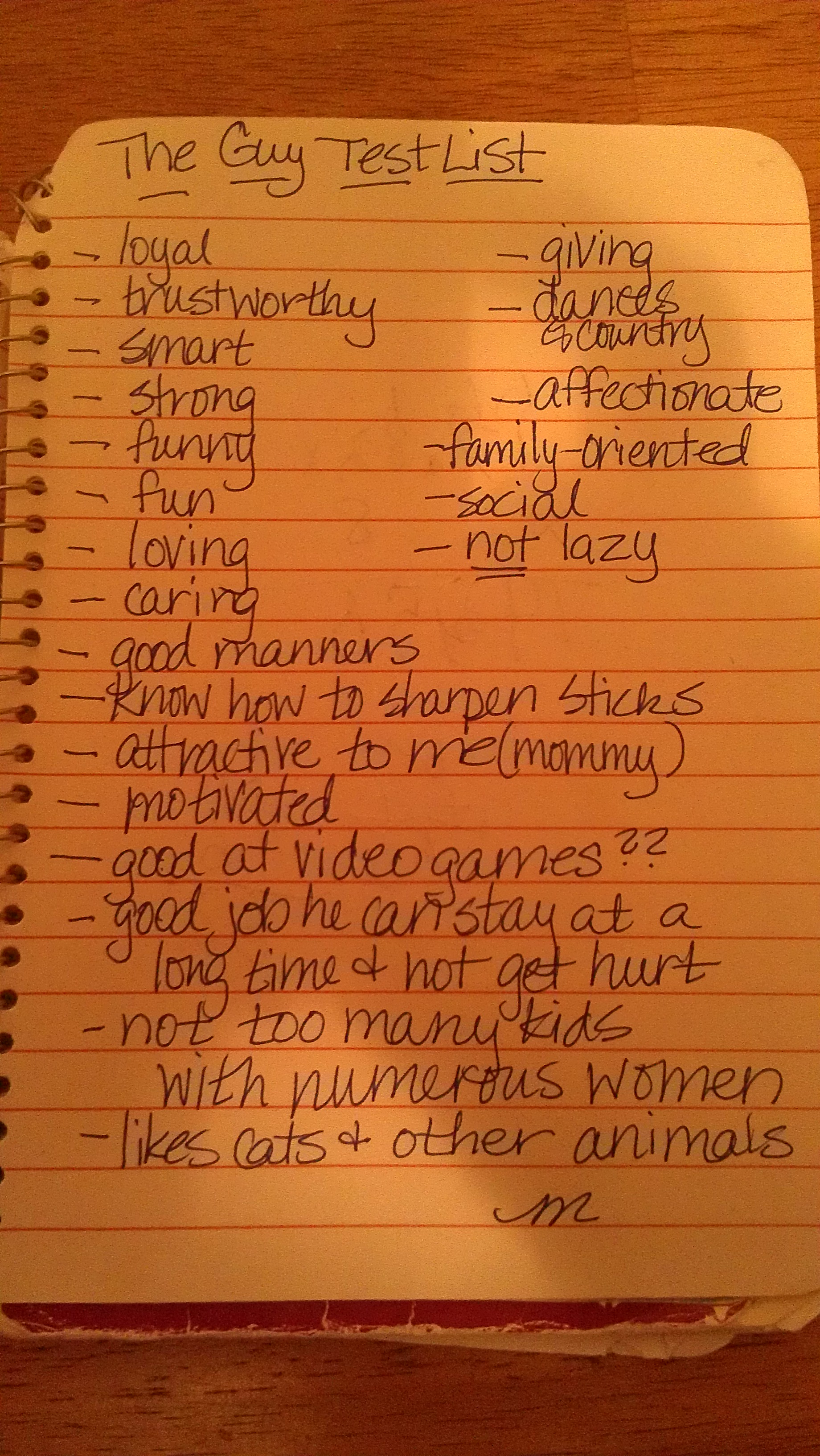 About two and a half years ago, after I had told my loser ex-boyfriend, Mr. ASPD, to kick rocks for the last time, and got a PFA to drive my point home, my son and I came up with “The Man Test List”. We happened to be sitting in a restaurant, waiting for our food, and I brought up the idea of making a list of qualities I would like to have in a guy. I had seen this list thing on Oprah awhile before this–you know, the one where they say to write a bunch of the qualities down you want in a man, and then put it away, and the guy with those qualities will come to you? After being with Mr. ASPD for 3 1/2 years and enduring loads of bullshit, I figured what the hell, I would try anything to get a good guy. So, my son and I put together the pictured list.